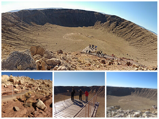 聽聞有直徑兩百多公里以上的知名隕石坑,想來卻是根本無法以人類的眼睛去欣賞感受坑的形狀和大小,是只能看衛星照片過乾癮。亞利桑那州隕石坑的大小,正好足以令人感受到它的「大」,直徑1.2公里,面積約20個美式足球場大,六十層樓高的深度 (170公尺)。巴林傑隕石坑年紀不大 (只有50,000年),地處荒漠高原氣候乾燥,巨坑地貌不易被侵蝕,更沒有人為的過度開發,得以保持最初渾然天成的樣貌。Meteor Crater 以它的大小、年代較近、缺乏植被和保存完好,在視覺上令人印象深刻,加上「世界上第一個被認證的隕石坑」冠冕,依然吸引絡繹不絕的人潮前來。12282017